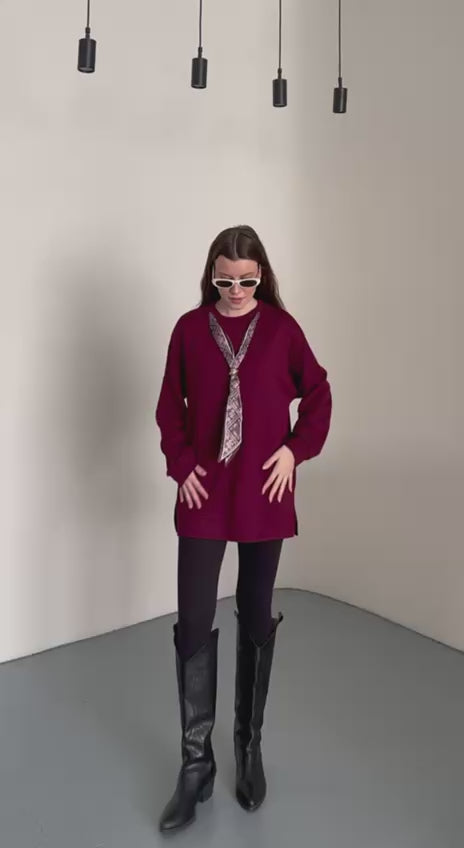 Fular Aksesuarlı Uzun Kollu Bordo Kadın Tunik