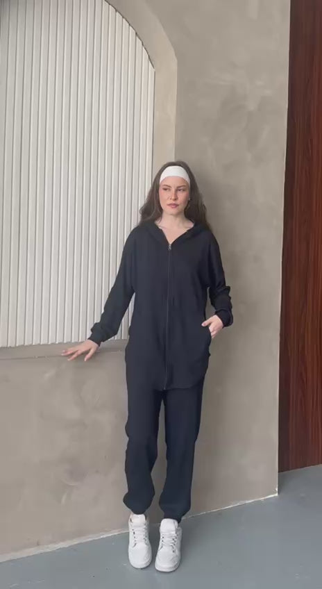 Konfor ve Stili Bir Arada Yaşayın: Siyah Fermuarlı Kapüşonlu Eşofman Takımı
